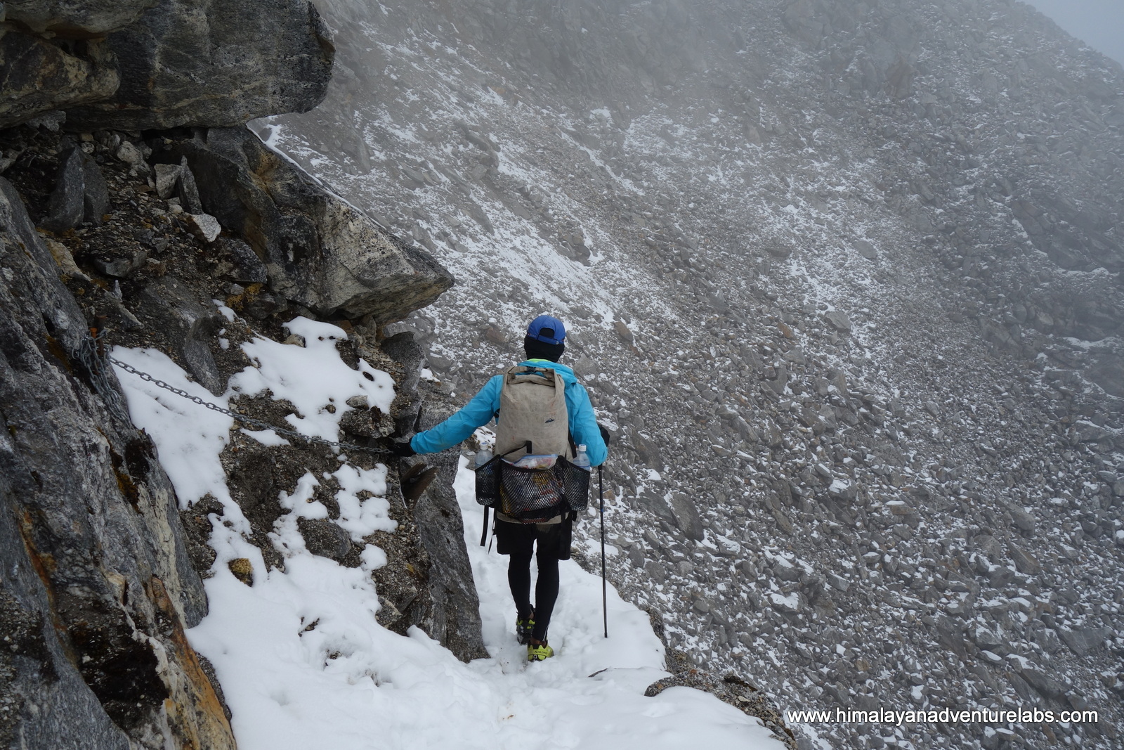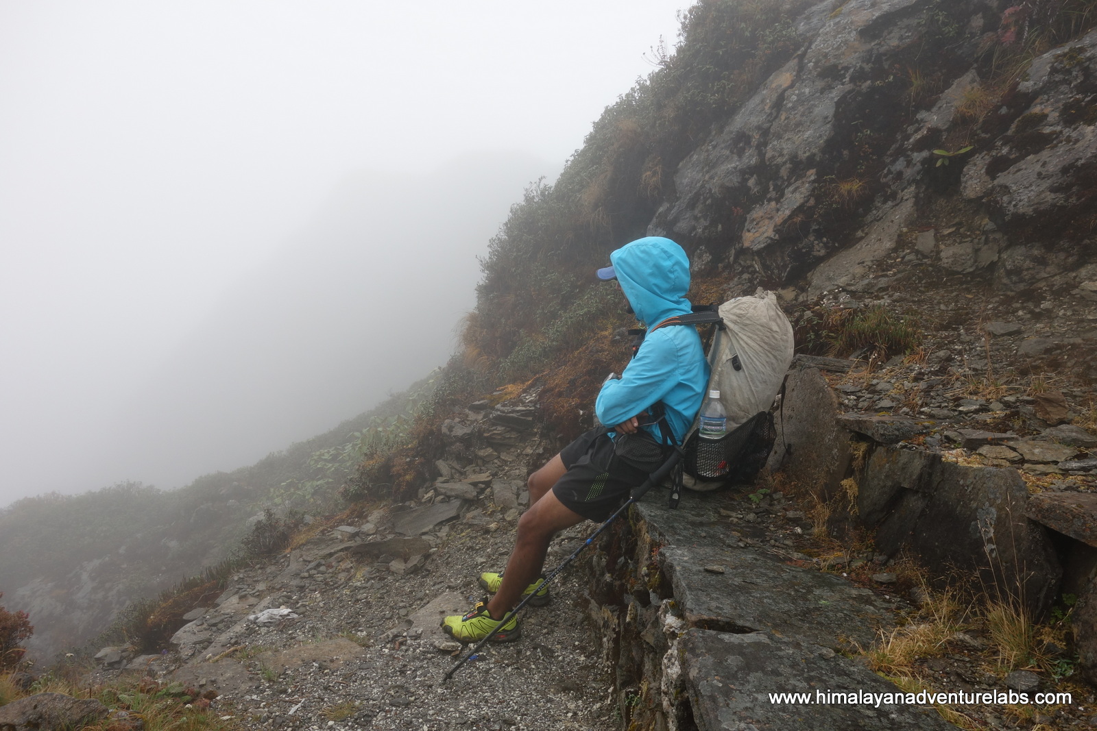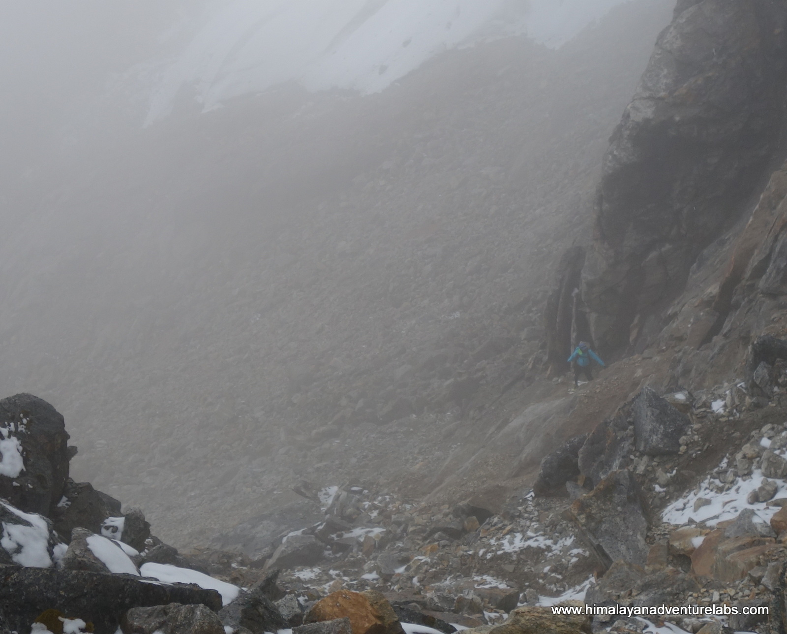 Then the clouds came in during the last ~100m of ascent which was mostly scrambling on loose rock. Can you spot Sudeep?