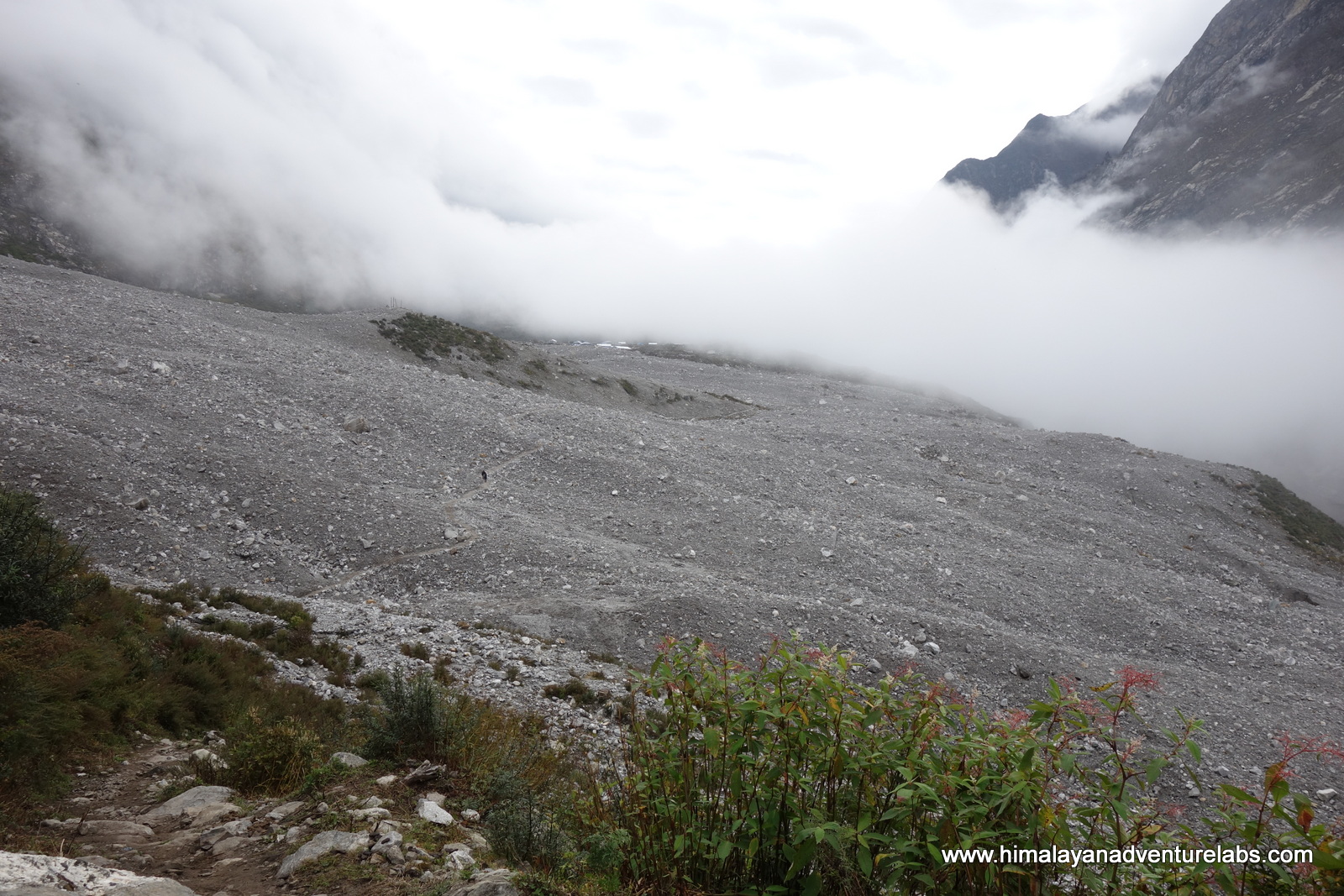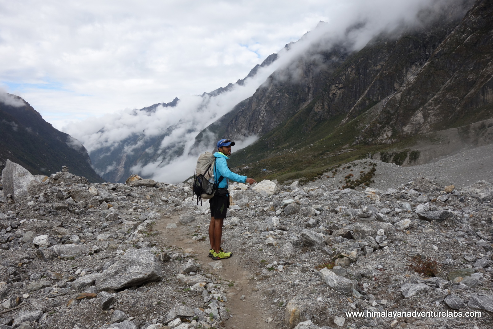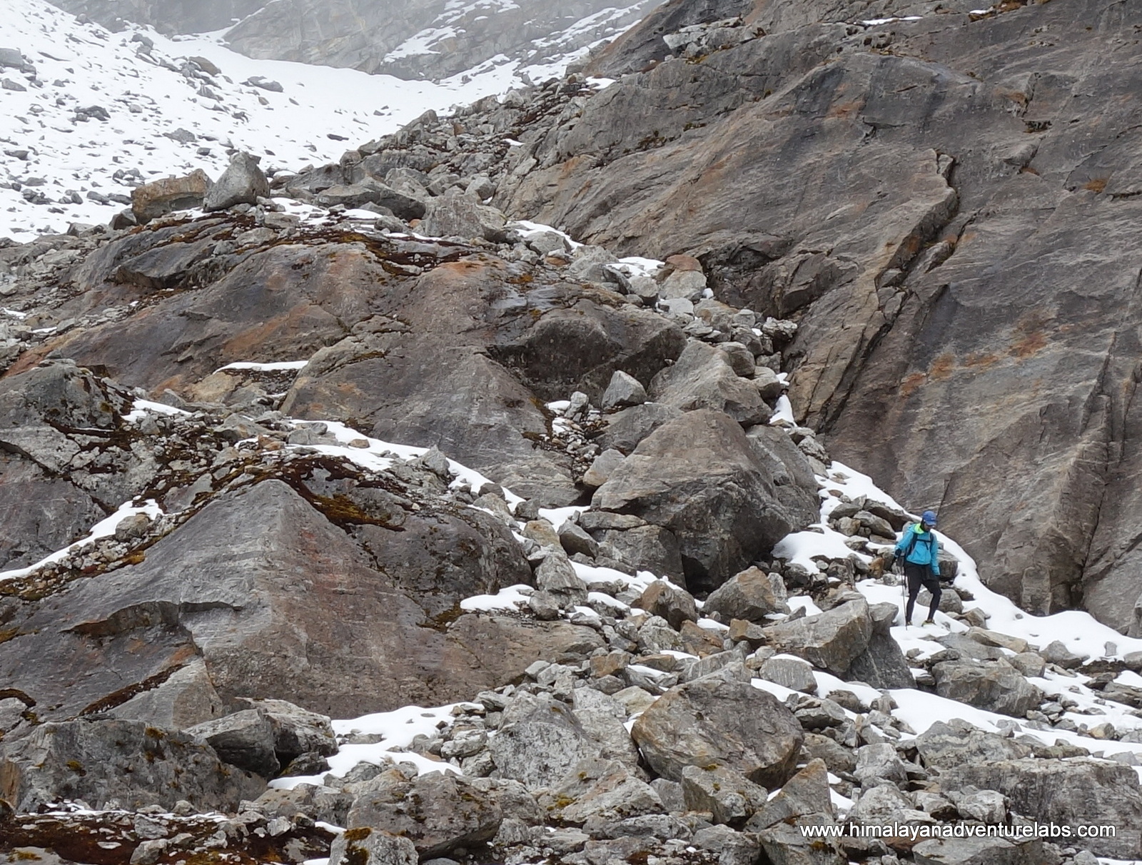 Then the clouds came in during the last ~100m of ascent which was mostly scrambling on loose rock. Can you spot Sudeep?