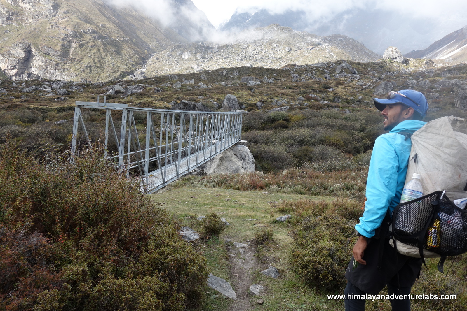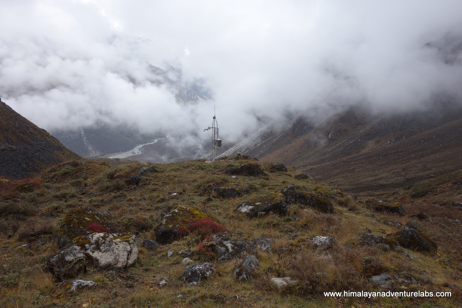 We are finally got off of the rock and onto tundra. A weird weather station greats us. The Langtang River is far below and so is our first hot food in three days.