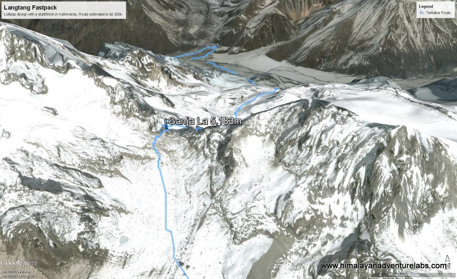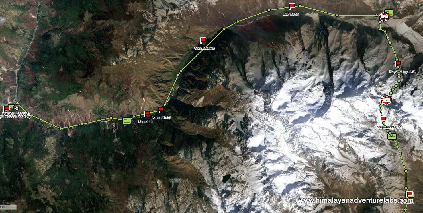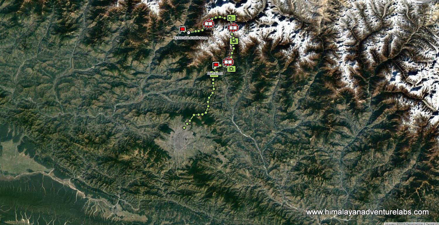 Our route into the Langtang Valley from bottom right (Kheldang) to top right (Kyang Jin Gompa ) in one push over pass. And then west in one day to Syrabu Besi running down the valley
